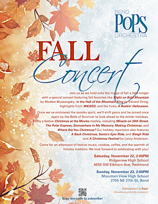 Our concerts are free to the public, but your contributions are greatly appreciated. All donations go directly to bringing our music to the people of Central Oregon. Donations to the 501(c)3 non-profit Bend Pops Orchestra are tax deductible. You can make donations at our concerts or give online at BendPops.org. Thank you for your continued support!